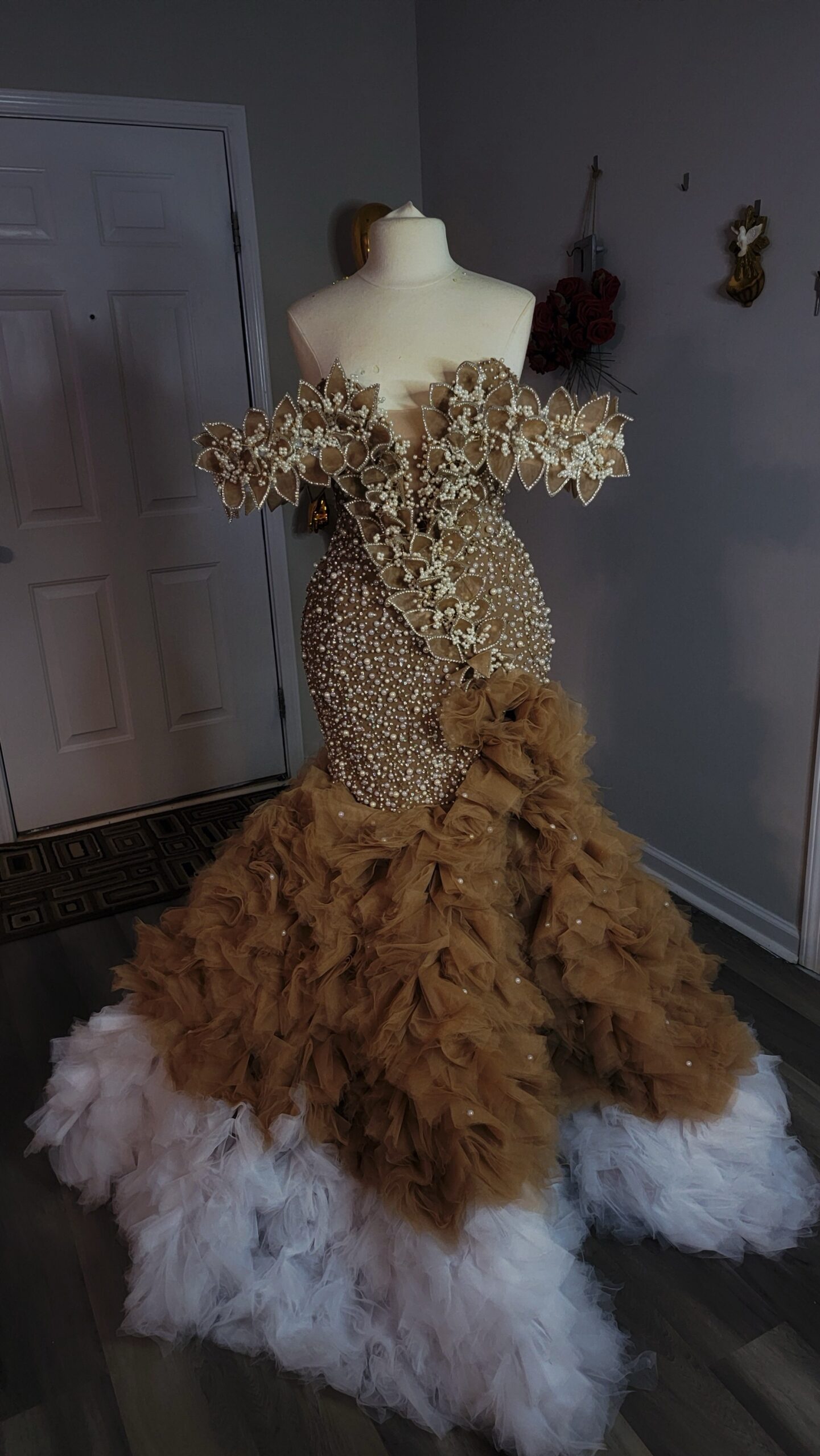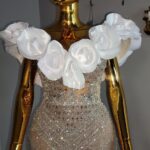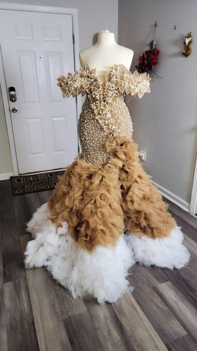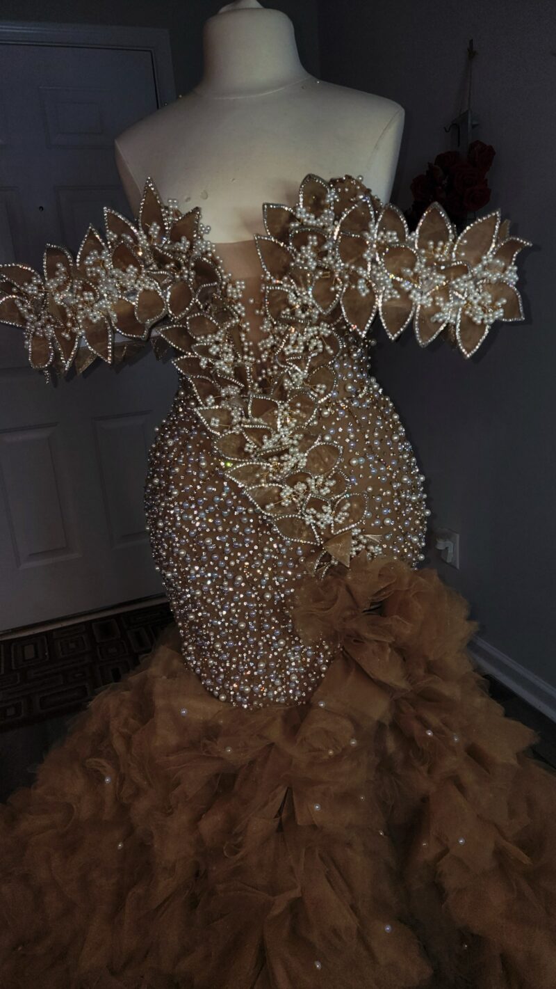 Luxury hand beaded corset dress with structured cape sleeves and customized petals stones and pearls